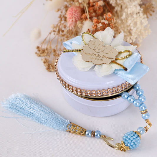 Personalized Pearl Prayer Beads in Metal Box Islamic Baby Shower Favor