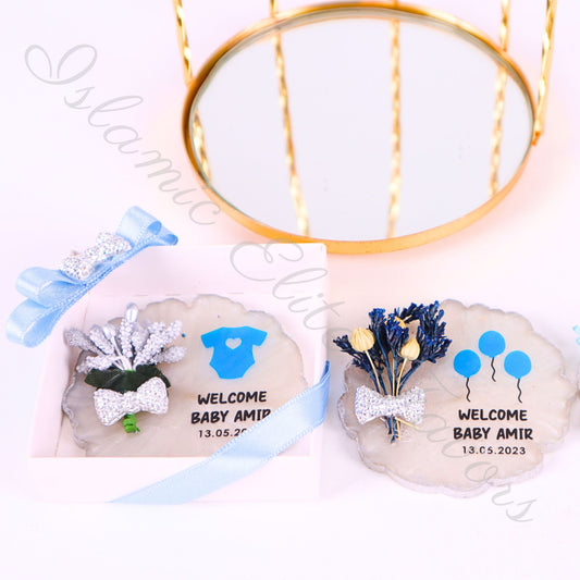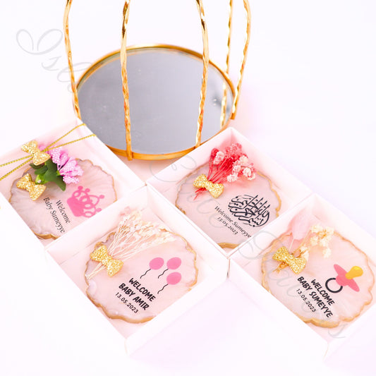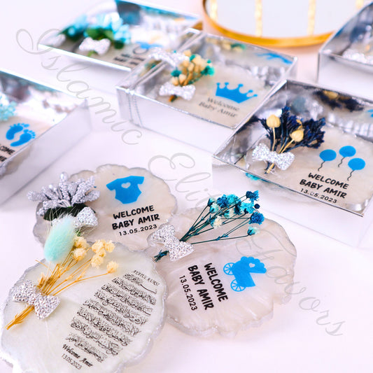 Personalized handmade Epoxy magnet Favors in different designs, sizes and acrylic mirror colors are best for Wedding Shower, Bridal Shower, Baby Shower, Engagement, Graduation, Birthday, Funeral, Ameen Party.