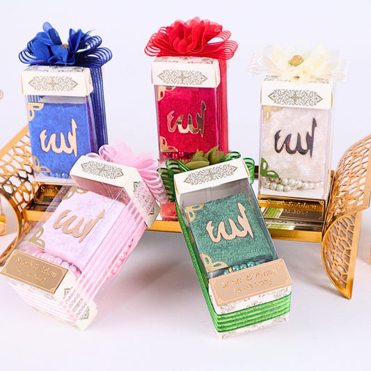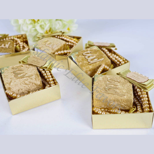 Personalized handmade velvet Mini Quran & Prayer Beads sets are best for Wedding Shower, Bridal Shower, Baby Shower, Engagement, Graduation, Birthday, Funeral, Ameen Party.