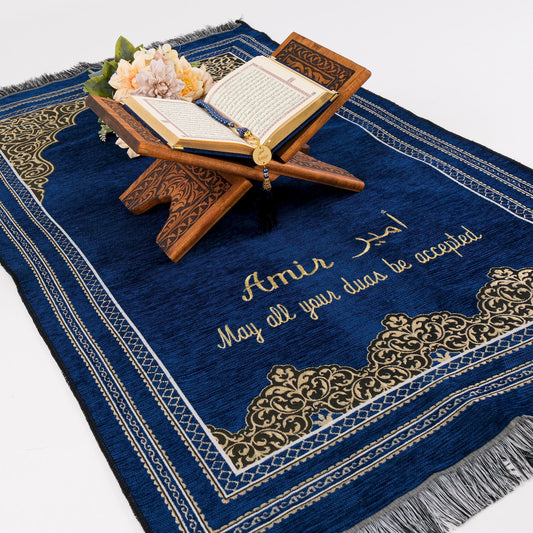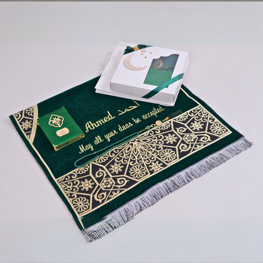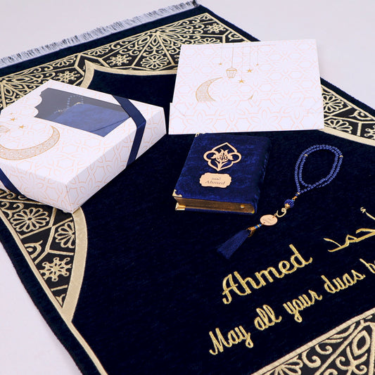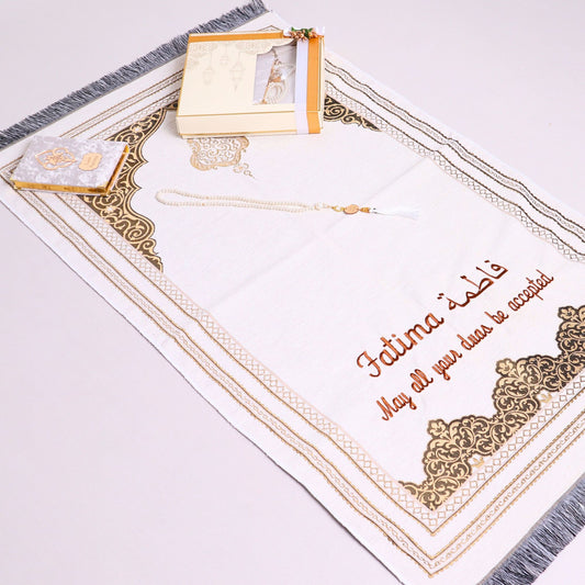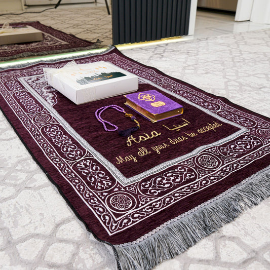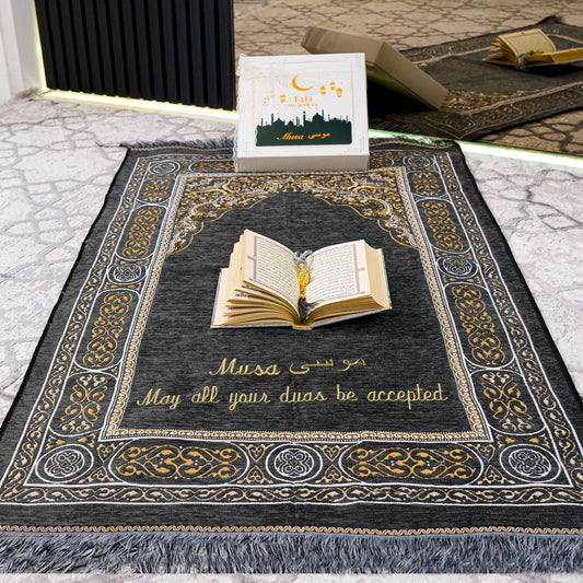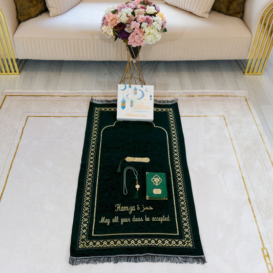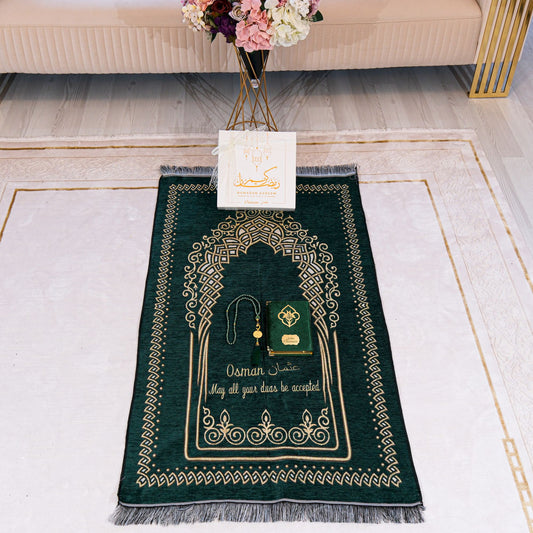 Personalized Chenille Prayer Mat Quran Tasbeeh Islamic Lux Gift Set