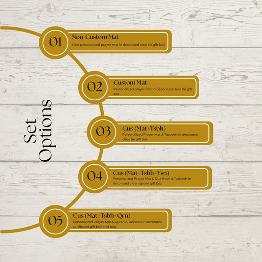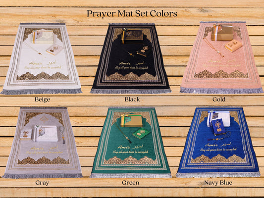 Personalized Medium Class Prayer Mat Quran Prayer Beads Sets in different designs and colors are best for Anniversary, Wedding, Ramadan, Eid, Birthday, Mother's Day, Father's Day, Valentine's Day.