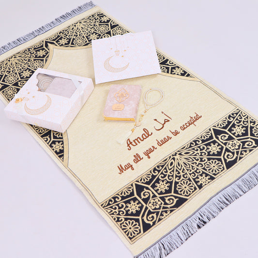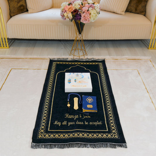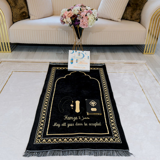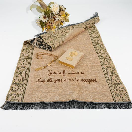 Personalized Medium Class Prayer Mat Quran Prayer Beads Sets in different designs and colors are best for Anniversary, Wedding, Ramadan, Eid, Birthday, Mother's Day, Father's Day, Valentine's Day.