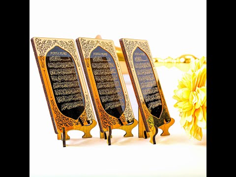 We can engrave any personalized message or phrase of your choice onto the black plexiglass below the Ayatul-Kursi, and onto the gold plexiglass label displayed outside the box.