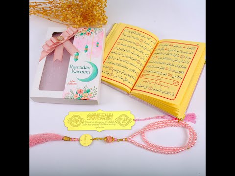 We can customize gold acrylic mirror tags of Dua Book and tasbeeh and we can also print custom names on the cardboard gift box.